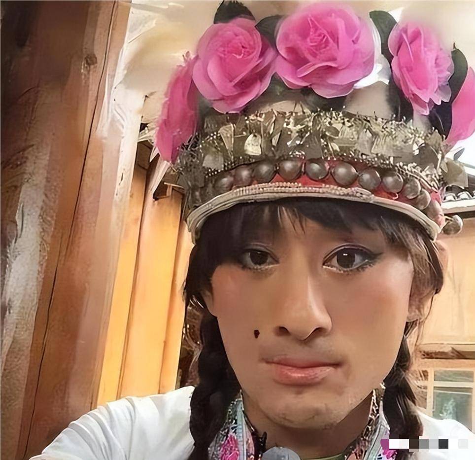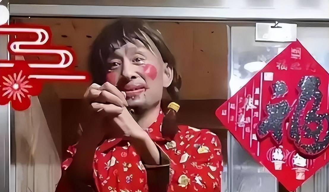 他戴着便宜的假发,编着两条麻花辫,脸上涂着诙谐的腮红,衣着大赤色的花棉袄扮丑。